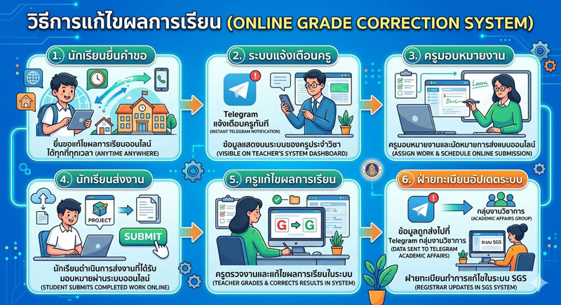 เมื่อมีการยื่นขอแก้ไขผลการเรียน Telegram จะแจ้งเตือนให้ครูทราบทันที พร้อมทั้งขมแสดงบนระบบของครูประจำวิชา ครูสามารถมอบหมายงานและนัดหมายการส่งแบบออนไลน์เพื่อให้นักเรียนทราบ เมื่อนักเรียนดำเนินการส่งงานที่ได้รับมอบหมายและครูแก้ไขผลการเรียนในระบบแล้ว ข้อมูลจะถูกส่งไปที่ telegram กลุ่มงานวิชาการ เพื่อให้ฝ่ายทะเบียนทำการแก้ไขในระบบ sgs ต่อไป
