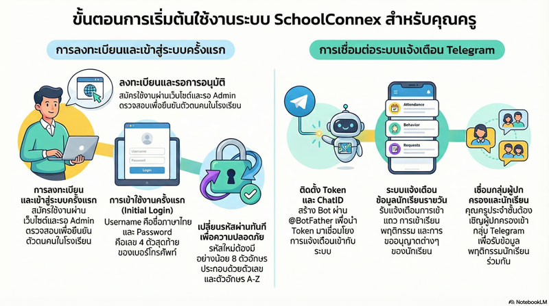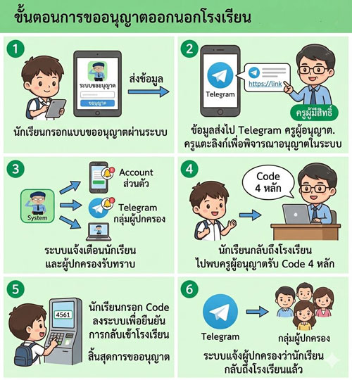 นักเรียนยื่นคำขอผ่านระบบ ครูอนุมัติทันที ผู้ปกครองรับทราบผ่าน Telegram