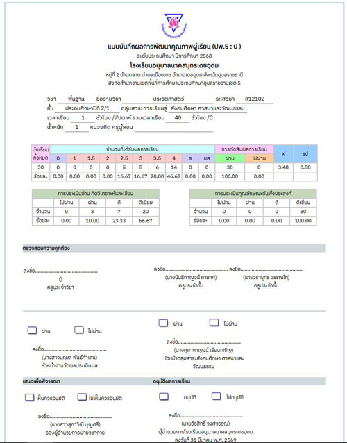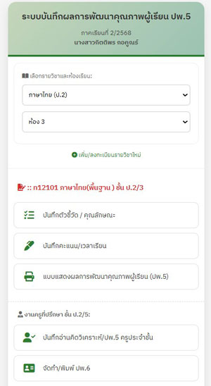 ระบบบันทึกผลการพัฒนาผู้เรียน (ปพ.5) สร้าง ปพ.5 ได้ง่าย ๆ เพียงเลือกวิชาที่สอน ระบบจะแสดงตัวชี้วัดปลายทางตามหลักสูตรใหม่ให้อัตโนมัติ ครูผู้สอนเพียงกำหนดคะแนนเต็มและสามารถนำไปใช้เก็บคะแนน ประเมินผลการอ่าน คิดวิเคราะห์และเขียน คุณลักษณะอันพึงประสงค์ผ่านแอปพลิเคชัน ระบบจะประมวลผลและจัดทำ ปพ.5 รูปเล่ม ให้โดยอัตโนมัติ จากนั้นข้อมูลจะถูกส่งต่อไปยังงานวัดผลเพื่อตรวจสอบความถูกต้อง และเสนอให้รองผู้อำนวยการฝ่ายวิชาการพิจารณาอนุมัติอย่างเป็นระบบ