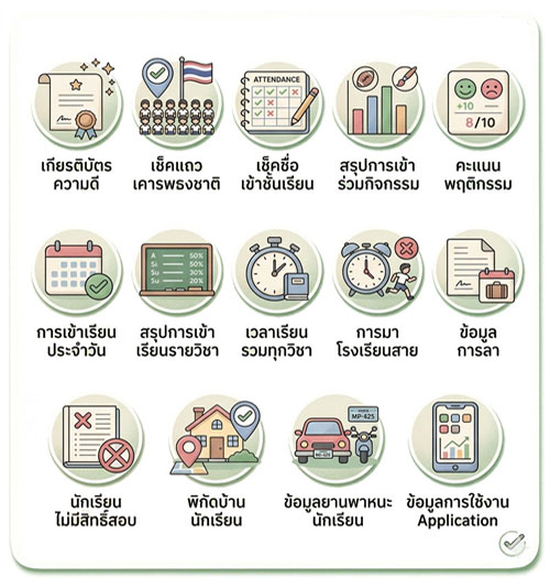 ครอบคลุมตั้งแต่การจัดการชั้นเรียน ปพ.5 ปพ.6 การวัดผล ประเมินผล ตารางสอน ไปจนถึงการประกาศผลการเรียน