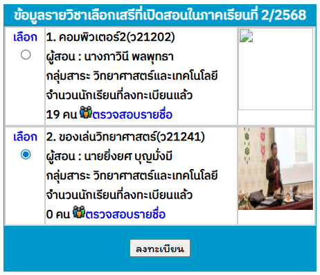 ระบบลงทะเบียนวิชาเลือกเสรี ช่วยอำนวยความสะดวกให้กับครูประจำวิชาเลือกเสรีในการเลือกรายวิชาของนักเรียนสามารถเลือกเรียนได้ตามความถนัดและความสนใจ ของตนเอง ซึ่งเป็นวิชาเพิ่มเติมบันจุในหลักสูตรสถานศึกษา โดยเมื่อครูต้องลงทะเบียนรายวิชาที่สอนเสร็จแล้วนักเรียนจะสามารถเลือกในระบบของตนเองได้ หลังจากนักเรียนเลือกแล้วครูสามารถเช็คชื่อ และดำเนินการจัดทำปพ.5 ได้เหมือนวิชาทั่วไป