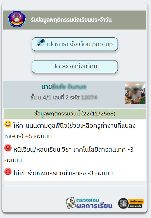 การแจ้งเตือนพฤติกรรมรายวันของนักเรียนในการปกครอง
