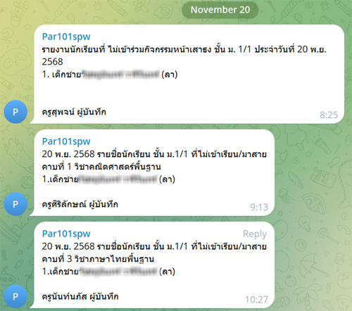 ผู้ปกครองสามารถรับข้อมูลพฤติกรรมของนักเรียนได้จาก 2 ช่องทางได้แก่ กลุ่ม Telegram ผู้ปกครองประจำชั้น และส่งในระบบดูแลช่วยเหลือเอง ซึ่งเป็นพฤติกรรมประจำวันส่วนตัวของนักเรียนในการปกครอง โดย ผู้ปกครองจะต้องเปิดระบบ popup และเสียงแจ้งเตือนไว้ หากมีการข้อมูลฟฤติกรรมเข้ามาจะมีเสียงแจ้งเตือนว่า "Update พฤติกรรมนักเรียน"