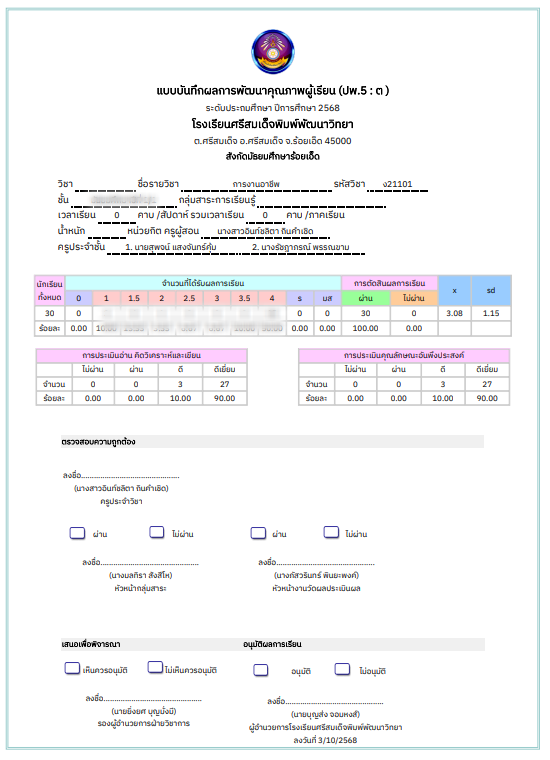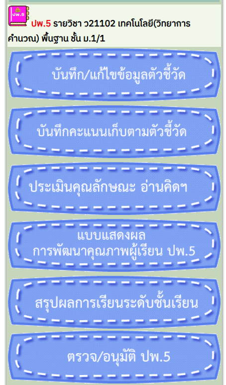 ระบบบันทึกผลการพัฒนาผู้เรียน ปพ.5 ปพ.6 ออนไลน์ สร้าง ปพ.5 โดยการเลือกวิชาที่สอน จะมีตัวชี้วัดปลายทางตามหลักสูตรใหม่ปรากฏขึ้นโดยอัตโนมัติ ครูผู้สอนเพียงแค่กำหนดคะแนนเต็มให้กับตัวชี้วัดและเก็บคะแนนผ่านโทรศัพท์มือถือ เมื่อครูประจำชั้นประเมินผลอ่านคิดวิเคราะห์และเขียน และคุณลักษณะอันพึงประสงค์ผ่าน Application เสร็จแล้ว ระบบจะประมวลผลเป็นปพ.5 รูปเล่มให้โดยอัตโนมัติ เมื่อครูประจำวิชาสร้าง ปพ.5 เสร็จแล้วระบบจะส่งข้อมูลไปให้กับงานวัดผลเพื่อตรวจสอบความถูกต้องและนำเสนอให้ผู้อำนวยการ หรือรองผู้อำนวยการฝ่ายวิชาการพิจารณาอนุมัติต่อไป