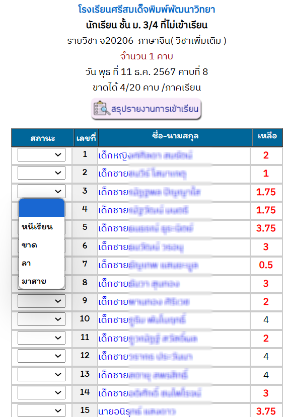 ข้อมูลการเข้าเรียนและการแก้ไขรายบุคคล