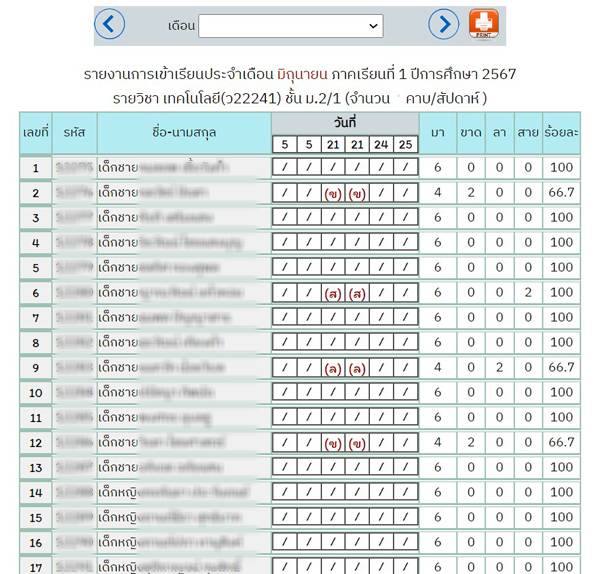 รายงานการเข้าเรียนรายเดือนและแสดงใน ปพ.5