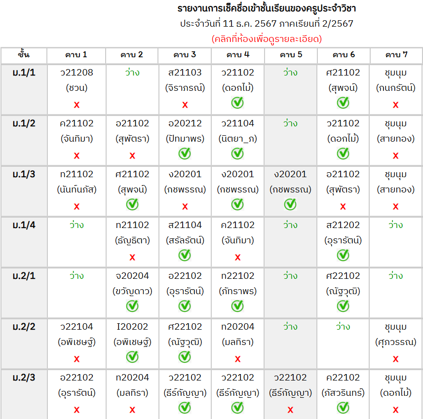 การเช็คชื่อเข้าชั้นเรียนรายคาบ ครูประจำวิชาสามารถเช็คชื่อนักเรียนในชั้นเรียน เพื่อเก็บลงในฐานข้อมูล แล้วสร้างรายงานการมาเรียนของนักเรียนประจำวัน สถิติการขาดเรียน คำนวณเวลาเรียนไม่ถึงร้อยละ 80 (มส.) ตัดคะแนนพฤติกรรมการขาดเรียนหรือหนีเรียน ตารางสอนรายวันและตรวจสอบการเช็คชื่อของครูประจำวิชา ส่งข้อมูลให้ ปพ.5 และส่งข้อมูลให้ผู้ปกครองรับทราบทันที่ผ่าน Application Telegram และระบบแจ้งเตือนผู้ปกครองรายบุคคล