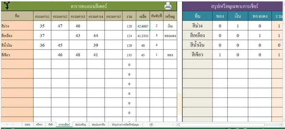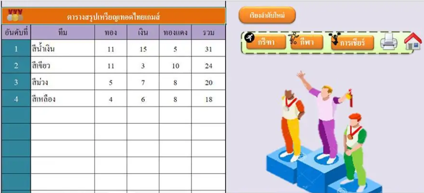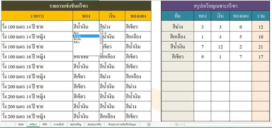 ใช้บันทึกข้อมูลต่างๆ ของการแข่งขันกีฬา สรุปผลการแข่งขัน ตารางสรุปเหรียญรางวัลอัตโตมัติ สามารถบันทึกรายการกีฬาได้หลายประเภท สรุปอันดับเจ้าเหรียญทองอัตโนมัติ