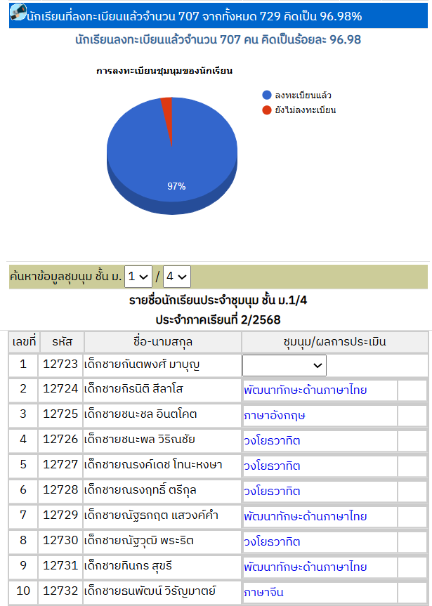 สถานะการลงทะเบียนชุมนุุม ครูประจำชั้นลงทะเบียนให้นักเรียนได้