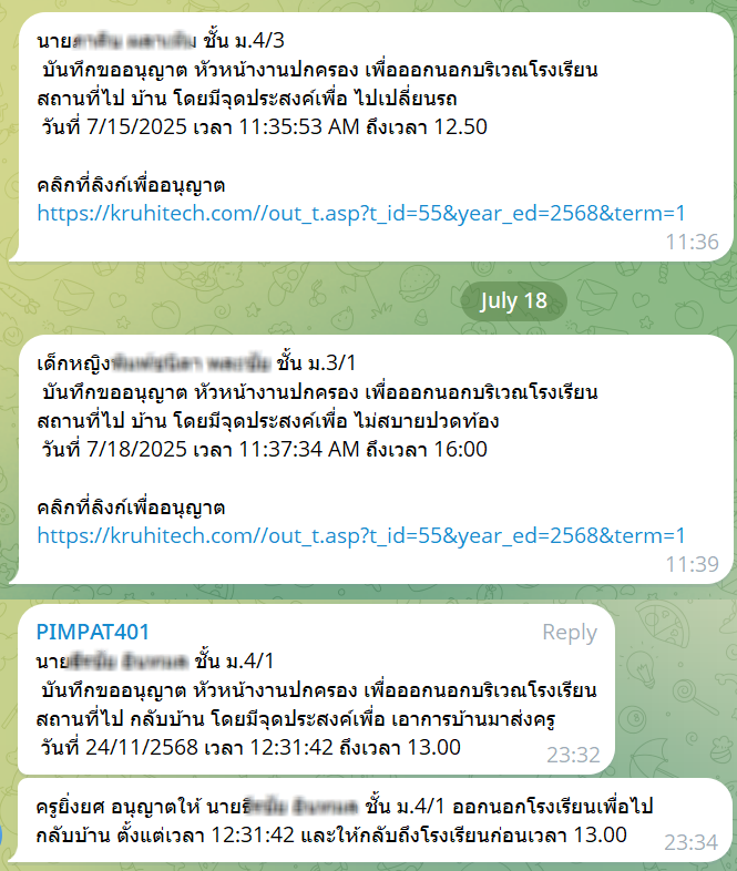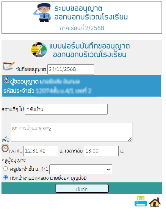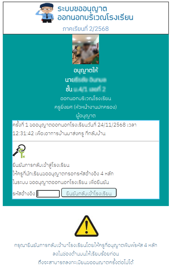 ระบบของนักเรียนขึ้นสถานะว่าอนุญาต นักเรียนสามารถออกนอกบริเวณโรงเรียนได้